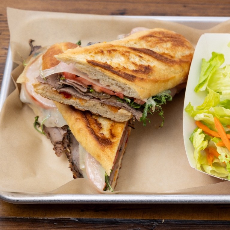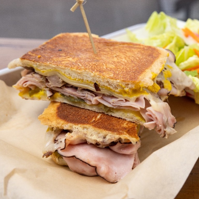 Delightful combination of pulled roast pork, savory smoked ham, creamy Swiss cheese, crisp pickles, and zesty mustard.