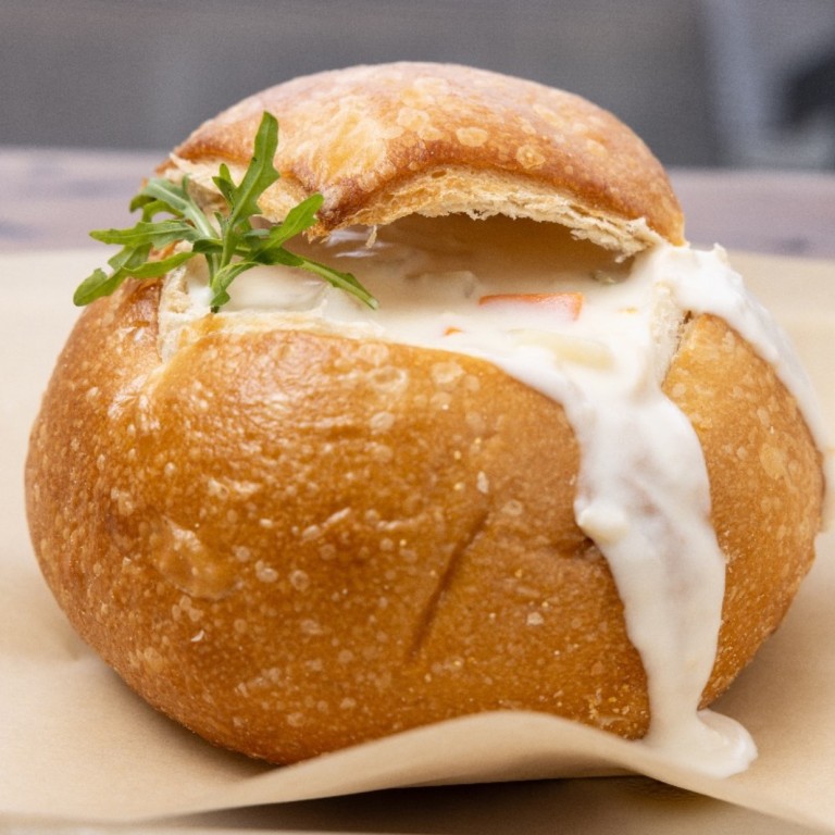 Creamy clam chowder with tender clams, diced potatoes, and carrots, served in a crusty bread bowl, garnished with fresh herbs.